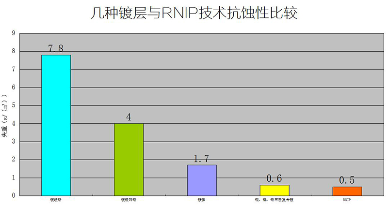 3、RNIP技術能極大地提高金屬工件的耐蝕性,按GB/T10125-1997標準進行鹽霧試驗,經RNIP技術處理后,工件抗蝕性大于180個小時,最高可達700個小時。